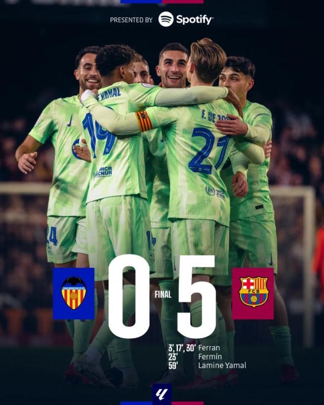 全场比赛结束,巴萨客场5-0大胜瓦伦西亚,成功晋级国王杯半决赛!